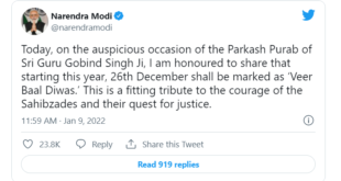 ਸ੍ਰੀ ਗੁਰੂ ਗੋਬਿੰਦ ਸਿੰਘ ਜੀ ਦੇ ਪ੍ਰਕਾਸ਼ ਪੁਰਬ ਮੌਕੇ ਪ੍ਰਧਾਨ ਮੰਤਰੀ ਨਰਿੰਦਰ ਮੋਦੀ ਨੇ ਅੱਜ ਵੱਡਾ ਐਲਾਨ ਕੀਤਾ ਹੈ। ਪੀ.ਐੱਮ. ਮੋਦੀ ਨੇ ਟਵੀਟ ਕਰਦੇ ਹੋਏ ਦੱਸਿਆ,‘‘ਇਸ ਸਾਲ ਤੋਂ ਹਰ 26 ਦਸੰਬਰ ‘ਵੀਰ ਬਾਲ ਦਿਵਸ’ ਦੇ ਰੂਪ ’ਚ ਮਨਾਇਆ ਜਾਵੇਗਾ।’’ ਉਨ੍ਹਾਂ ਨੇ ਕਿਹਾ,‘‘ਅੱਜ ਸ੍ਰੀ ਗੁਰੂ ਗੋਬਿੰਦ ਸਿੰਘ ਜੀ ਦੇ ਪ੍ਰਕਾਸ਼ ਪੁਰਬ …