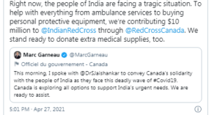 ਭਾਰਤ ਦੀ ਕੋਵਿਡ ਖ਼ਿਲਾਫ਼ ਲੜਾਈ ਵਿੱਚ ਕੈਨੇਡਾ ਨੇ ਸਾਥ ਦੇਣ ਦਾ ਐਲਾਨ ਕੀਤਾ ਹੈ। ਕੈਨੇਡਾ ਦੇ ਪ੍ਰਧਾਨ ਮੰਤਰੀ ਜਸਟਿਨ ਟਰੂਡੋ ਨੇ ਰੈੱਡ ਕ੍ਰੋਸ ਰਾਹੀਂ 10 ਮਿਲੀਅਨ ਡਾਲਰ ਦਾ ਫ਼ੰਡ ਦੇਣ ਦਾ ਐਲਾਨ ਕੀਤਾ ਹੈ। ਉਨ੍ਹਾਂ ਟਵਿੱਟਰ ਰਾਹੀਂ ਇਹ ਐਲਾਨ ਕਰਦੇ ਹੋਏ ਕਿਹਾ ਹੈ ਕਿ ਭਾਰਤ ਦੇ ਹਾਲਾਤ ਕਾਫ਼ੀ ਗੰਭੀਰ ਹਨ …